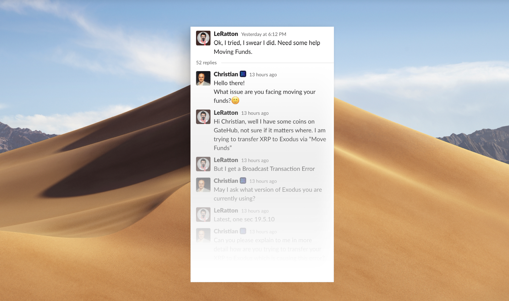 So, before I spent hours on this, I wanted to chat with the Exodus team on their Slack channel and ask if this feature was enabled or if problems had been reported.