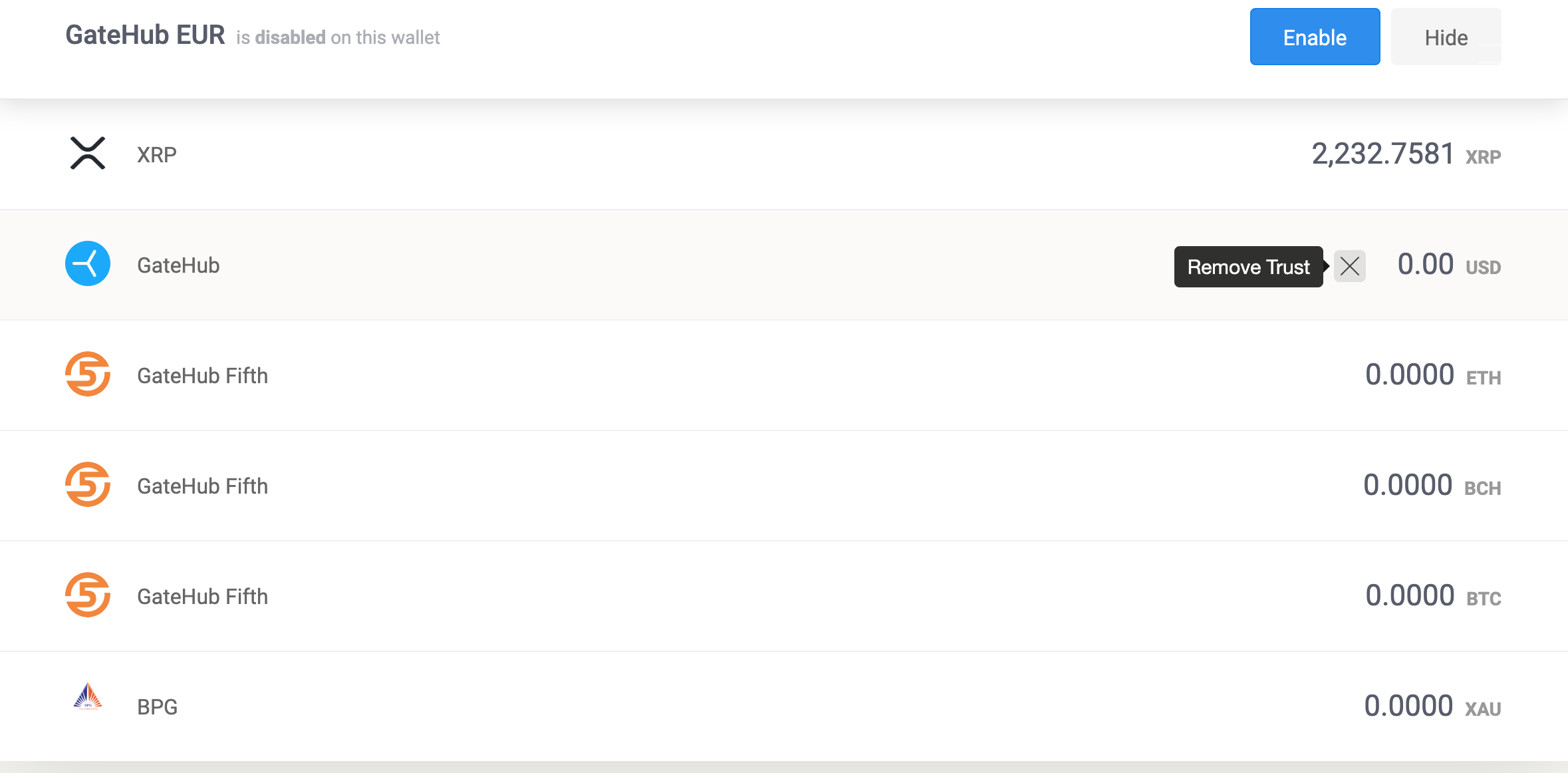 So I head back to GateHub and look for any open orders, none there. Then, I look for any enabled Trusted Line and there are 5 of those enabled.