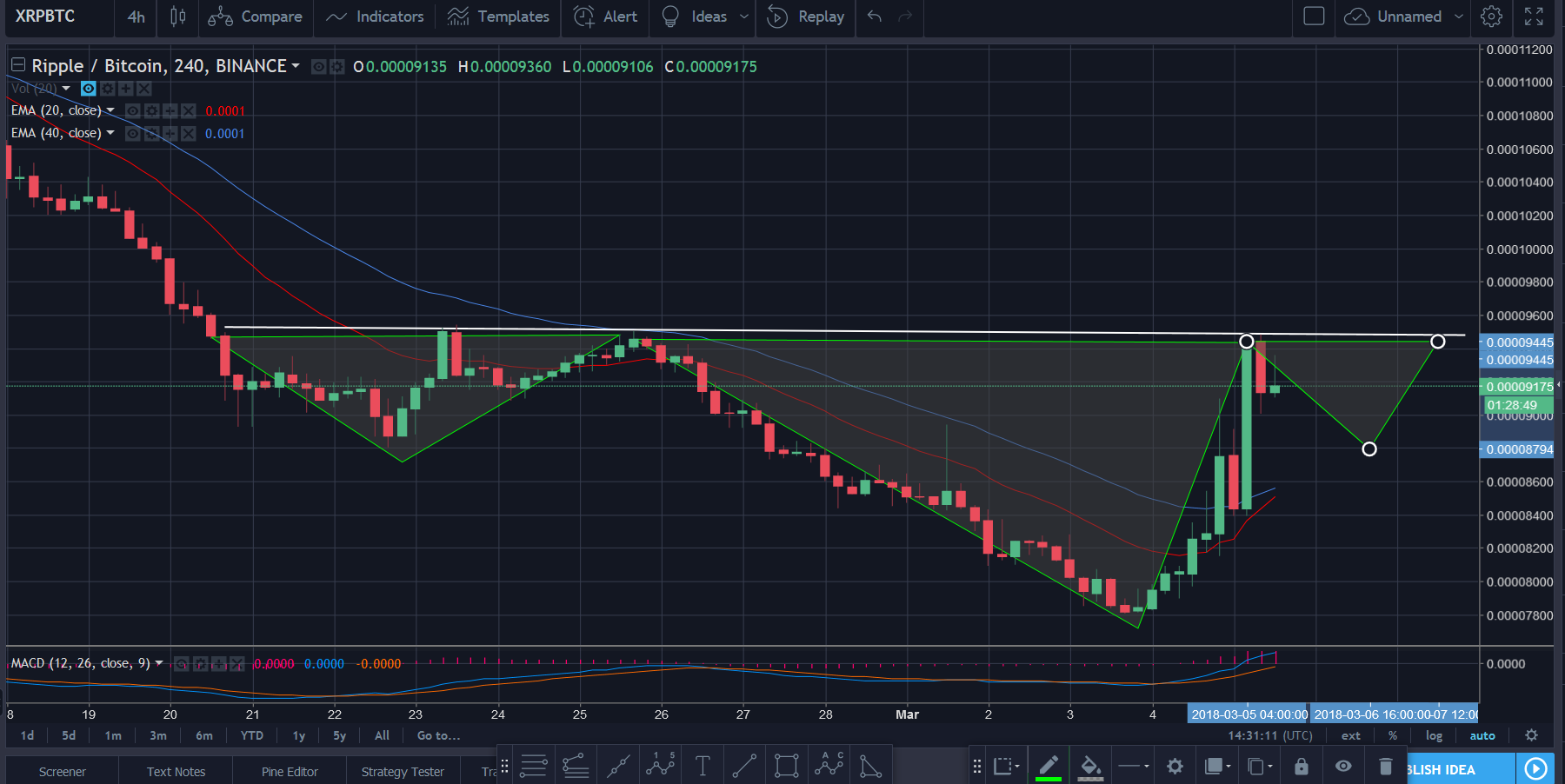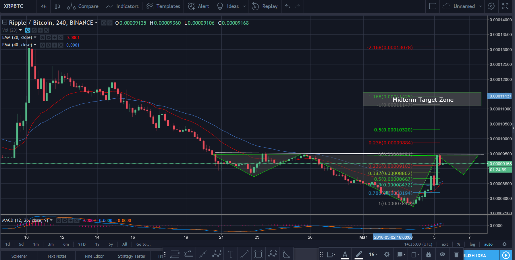 This pattern gives us a target of 11000ish zone which could be middle of Impulse Wave 3. MACD is also in line with this pattern, Volume needs to continue to flow in. Exciting times ahead for ripple possible.