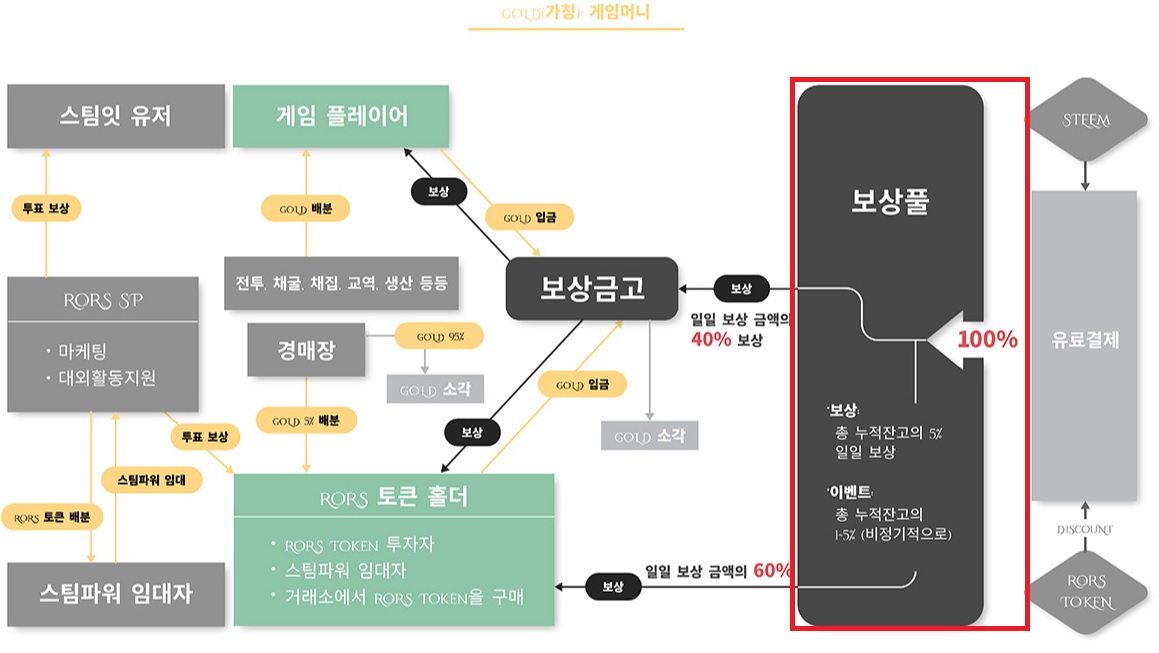 ROR 결제 계정으로부터 파워다운된 STEEM은 ROR 보상풀 계정으로 옮겨지고 ROR 보상풀 계정은 입금된 STEEM을 7일로 나누어 매일 동일한 금액을 RORS 토큰 홀더와 게임 플레이어에게 배당합니다.