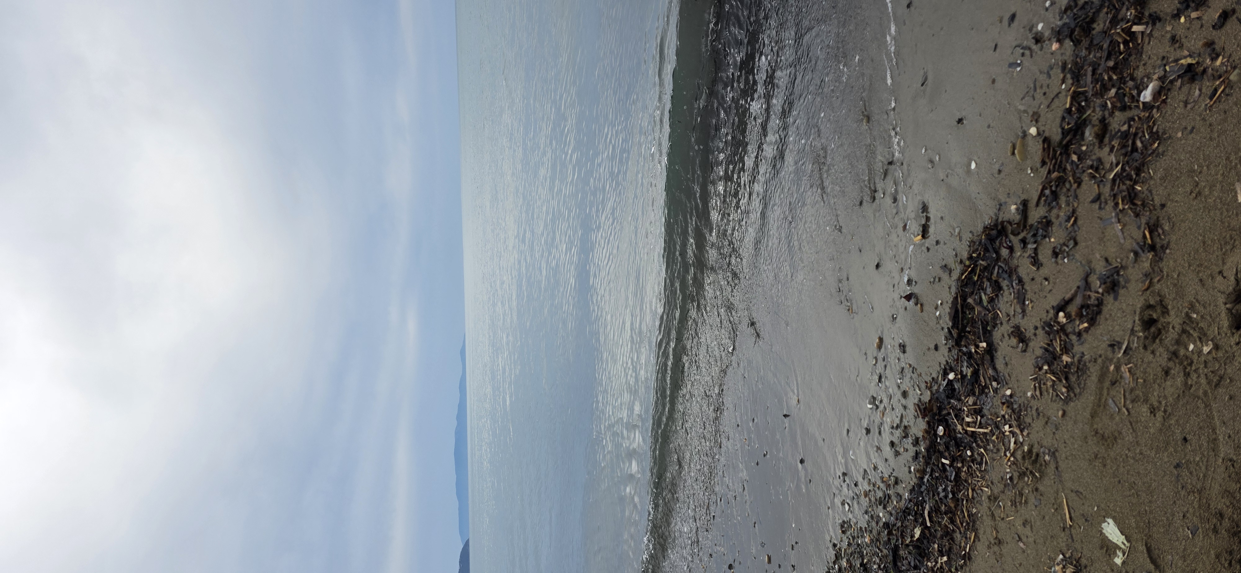 Nisipul umed, de o nuanță brun-aurie și saturat de tăceri, păstrează urmele efemere ale valurilor care se retrag cu un murmur discret, aproape șoptit. Este o mare calmă, însă profundă, a cărei suprafață oglindește griul perlat al norilor denși, creând o atmosferă de o liniște aproape mistică, tulburată doar de scânteierea metalică a apei la orizont.