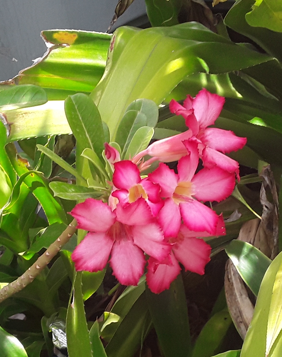 Hoy amanecí con un hermoso sol de primavera y cuando me acerqué a mi jardín, observé como una hermosa Rosa del Desierto nos abría las puertas de un nuevo día, cultivo y con cuidados propios, le ofrecen un colorido extraordinario que conecta con la naturaleza y sus bondades, los invitó a disfrutarla.