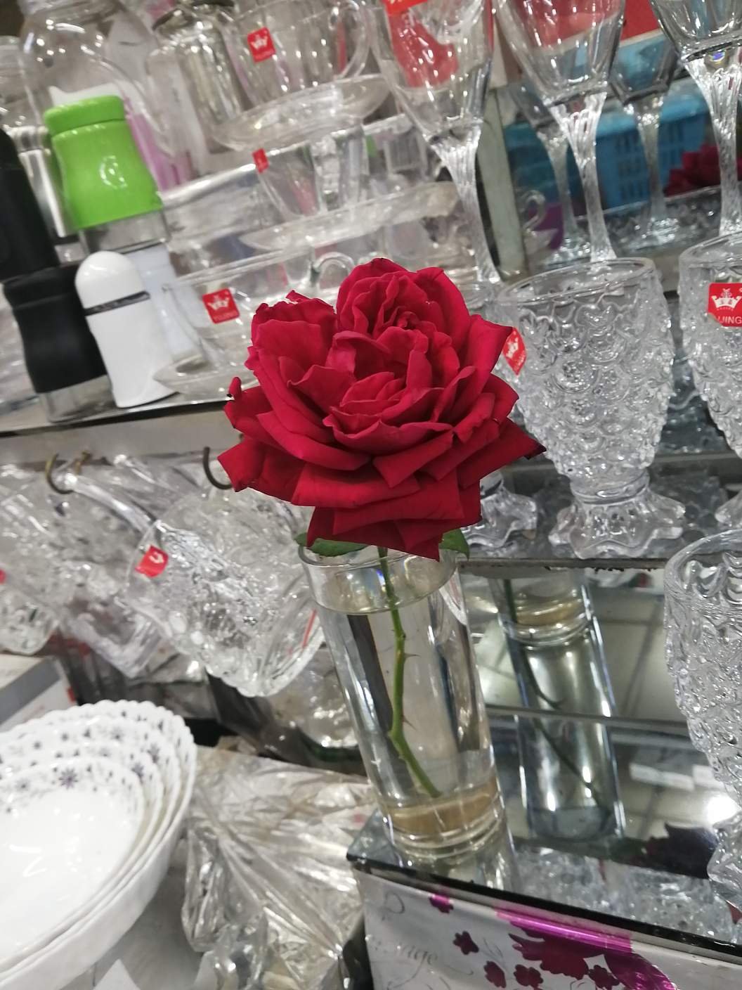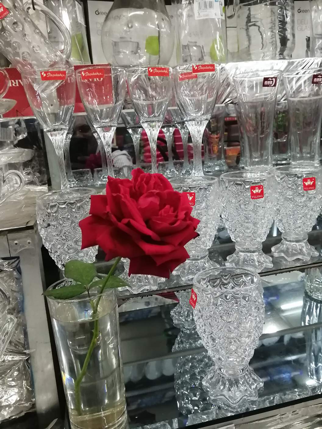 One of the many glasses is fresh red roses in a glass. The rose is kept fresh with water in the glass.
