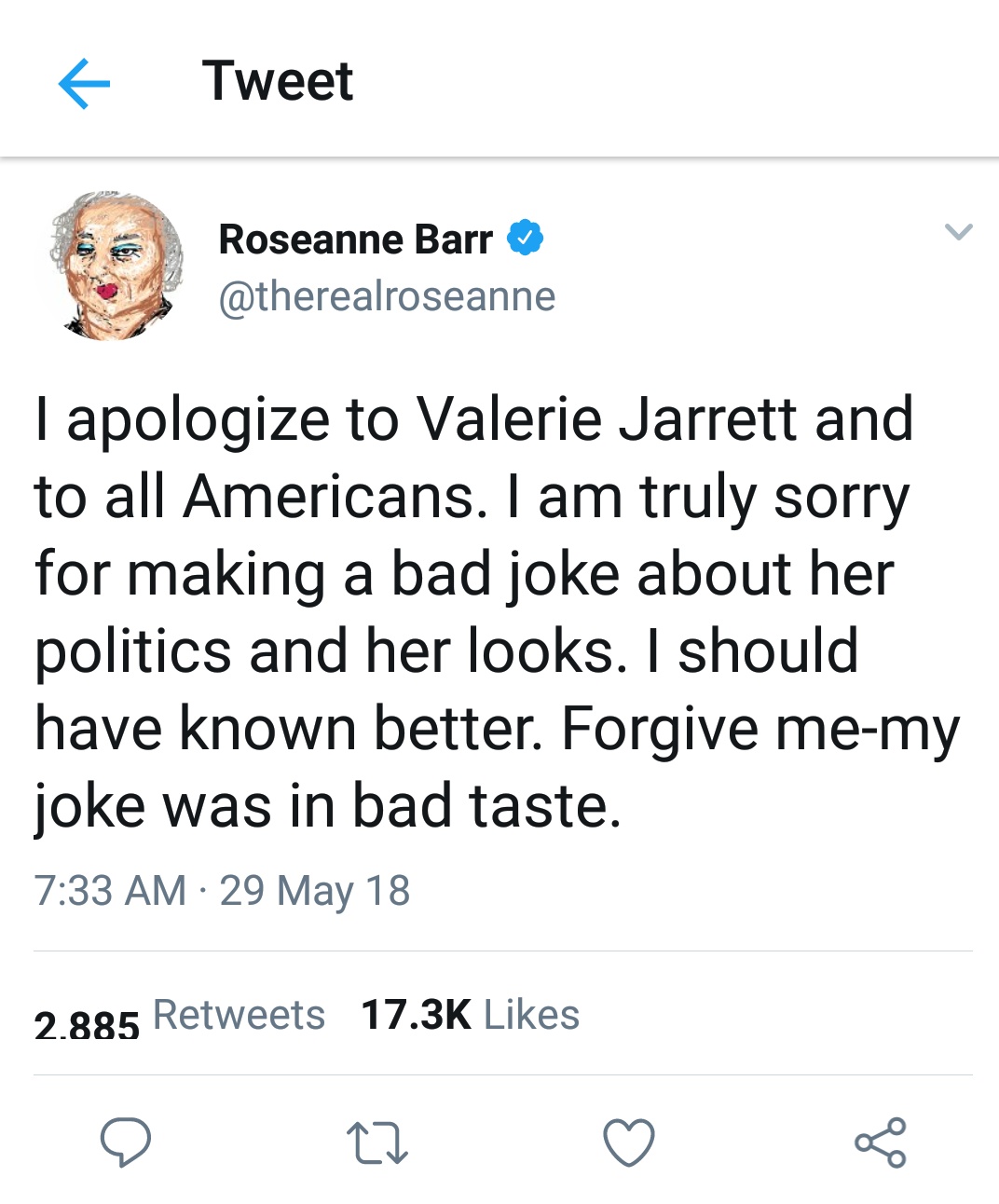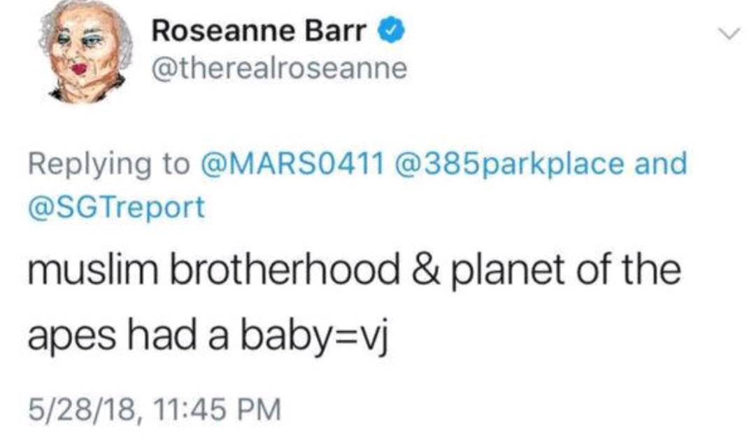 I was literally watching the episode of the reboot of Roseanne where she, Roseanne, comes to terms with and even stands up for, even if only slightly, her new Muslim neighbors. I'm like whoa, is this real? So I do some digging because the original tweet has been deleted and she is saying she's quitting twitter and I feel it's important to discuss this. It threw me off guard. Amid all this other stuff going on, ya know, every actor in Hollywood being a rapist, now we got this?