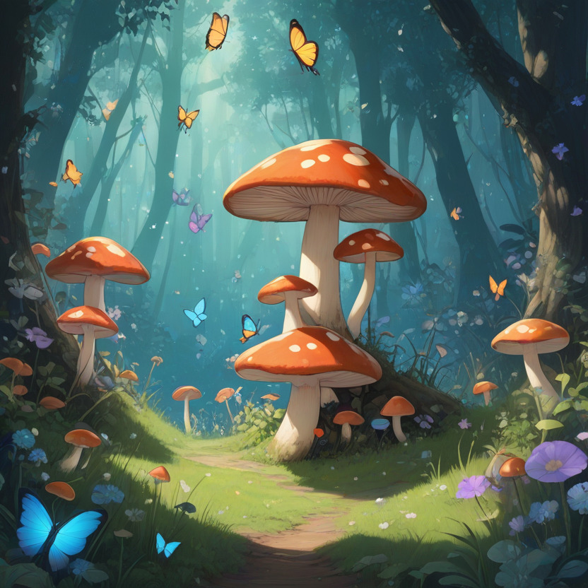 @jsup !gen glade with mushrooms, fluttering butterflies