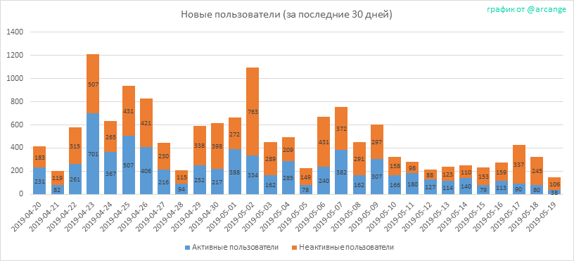 Внимание: этот график является динамическим! Пользователь может зарегистрироваться в один день и стать активным несколько дней спустя. Таким образом, количество активных пользователей за конкретные даты может измениться со дня на день.