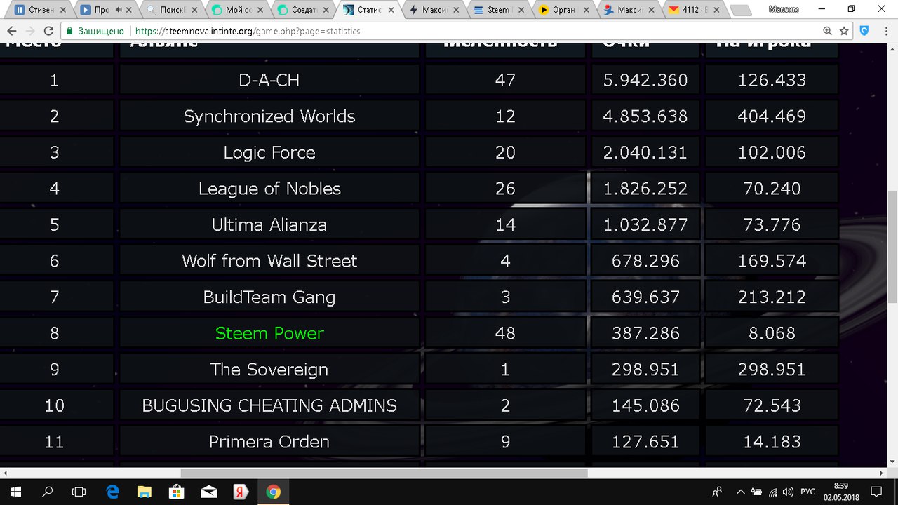 Альянс Steem Power прибавил чуть более 30к очков за сутки!(и это несмотря на мои потери-10к и соклановца-5к участвовавшего в той битве) И мы по прежнему в топ 8! И нас уже 48.
