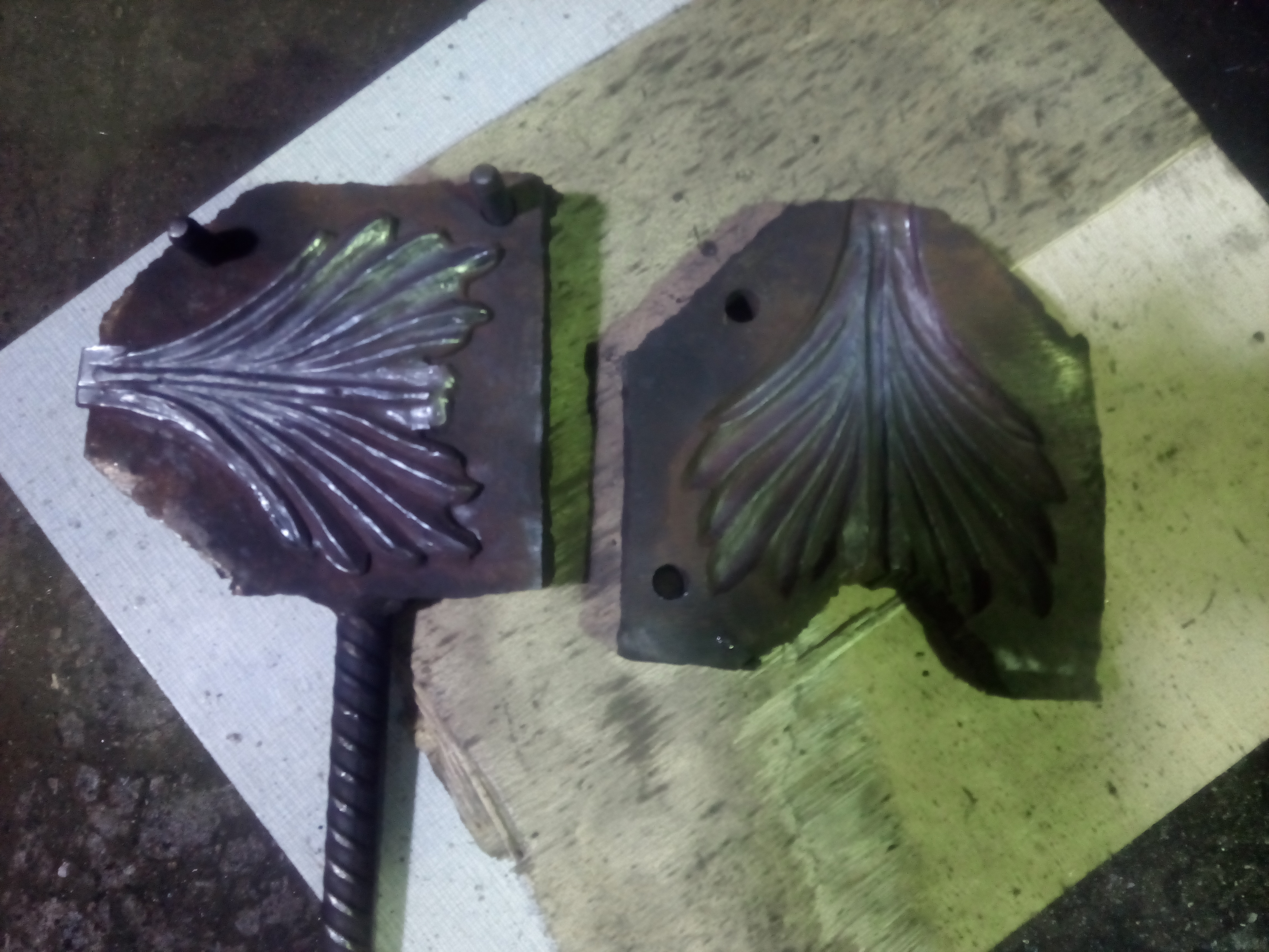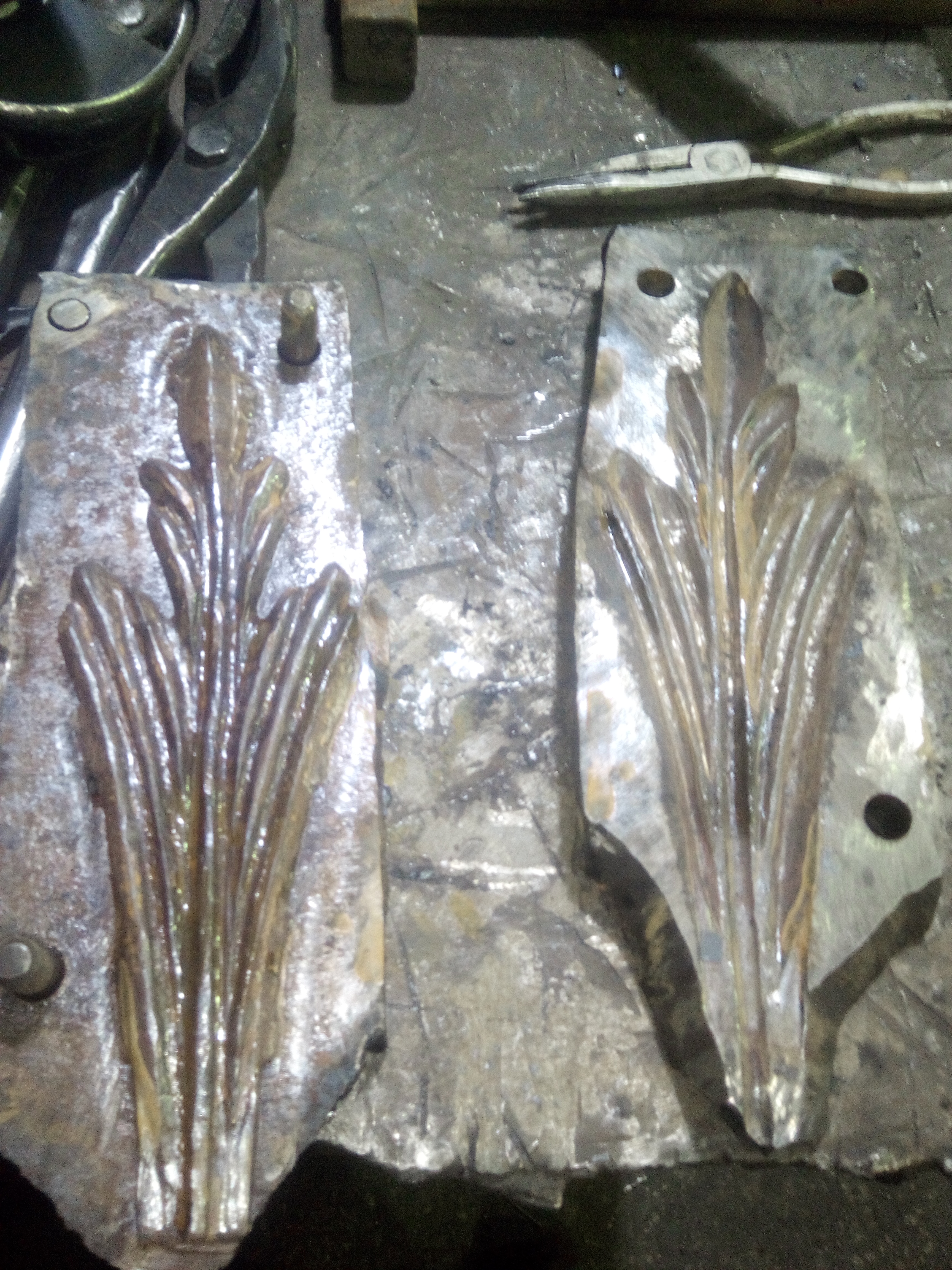 Штамп под них состоял из двух частей ( о том ,как изготавливать штампы смогу написать позже, будет время мне покажут что и как и мне еще придется не раз это делать) , так как листья длинные и не поместятся под молот целиком.