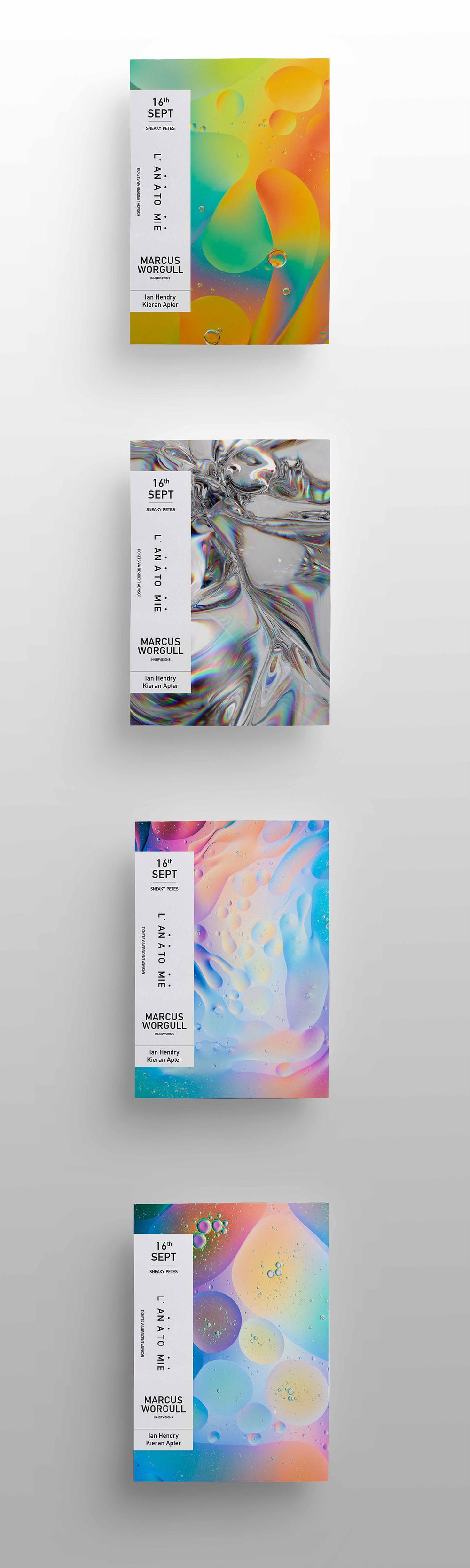 Для запуска L'Anatomie мы сделали плакаты, которые инкапсулировали всю суть танцевальной музыки и своей целевой аудитории. Вы можете их увидеть справа. Мы работаем с артистами таких брендов, как Innervisions, keinenmusik и другими техно-хауз артистами. Плакаты были разработаны специальным образом с использованием зернистой текстуры. Были использованы тематические изображения. Мы это сделали для того, чтобы была отражена атмосфера, которую мы стараемся создать на наших мероприятиях.