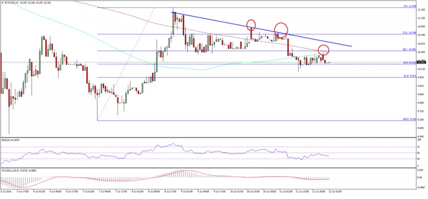 После падения на несколько пунктов ниже $10, цена эфир возобновила рост. Стоит заметить, что соотношение ETH/USD в основном подвержено негативным прогнозам, а это значительно притормаживает дальнейший рост. Первой зоной сопротивления является низкий средний 100-часовой коэффициент, и это в свою очередь, влияет на застой цены эфир.