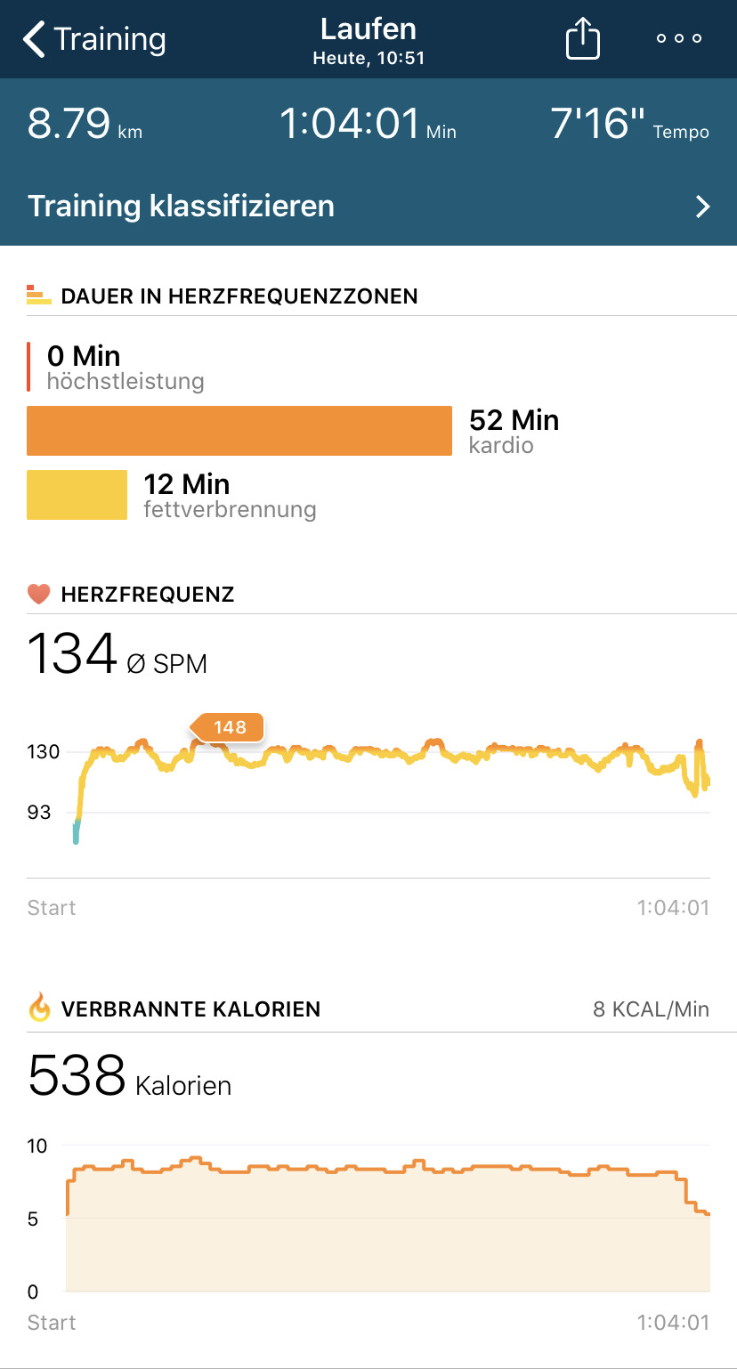 The book also includes training plans for different running distances. So I started with from 0 to 18 km in 12 weeks. In my case not from zero, as I already did 11km distances, but to running 4 days per week instead of maximal 1 day per week.