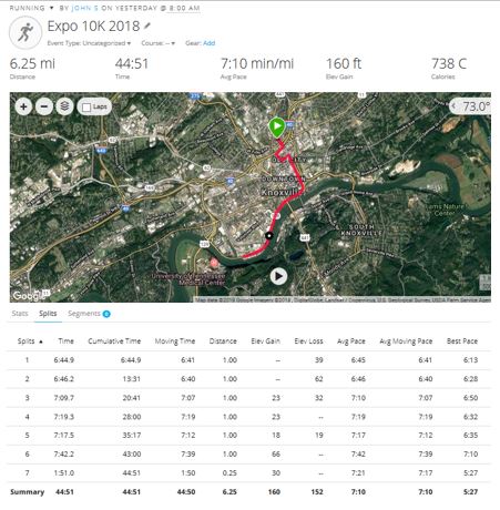 I never really set an official time goal for this race as I was unsure about the exact elevation profile, but that wasn't the main factor in my running a 44:49 time and my watch registered a 7:10 pace per mile. Official results were 7:14 per mile but my distance was a tiny bit farther than an exact 10k which is part of the discrepancy in the watch result and the reported race result.