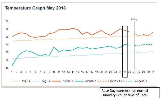 The weather here has been unseasonable warm but the humidity was the killer. 88% relative humidity during a race is a recipe for bad things to happen if you don' know the dangers and the temp is room temperature or higher. At least a dozen who got sick or didn't finish learned the hard way.
