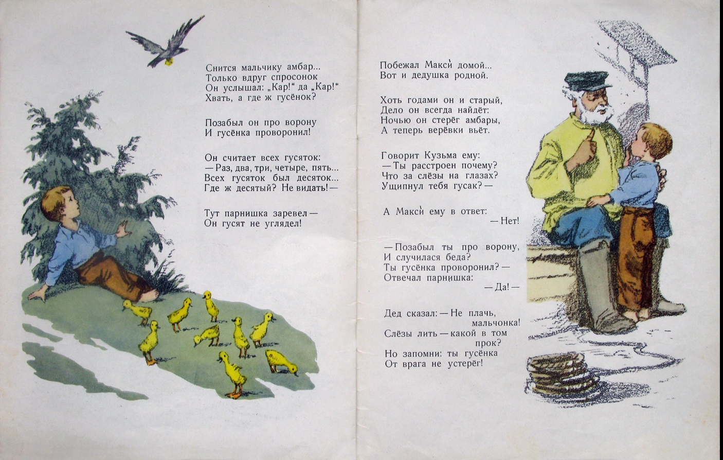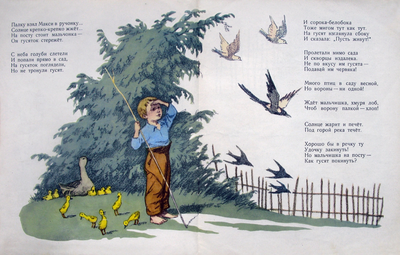 The story of the boy, who was instructed to protect the goslings from birds of prey. But the boy fell asleep