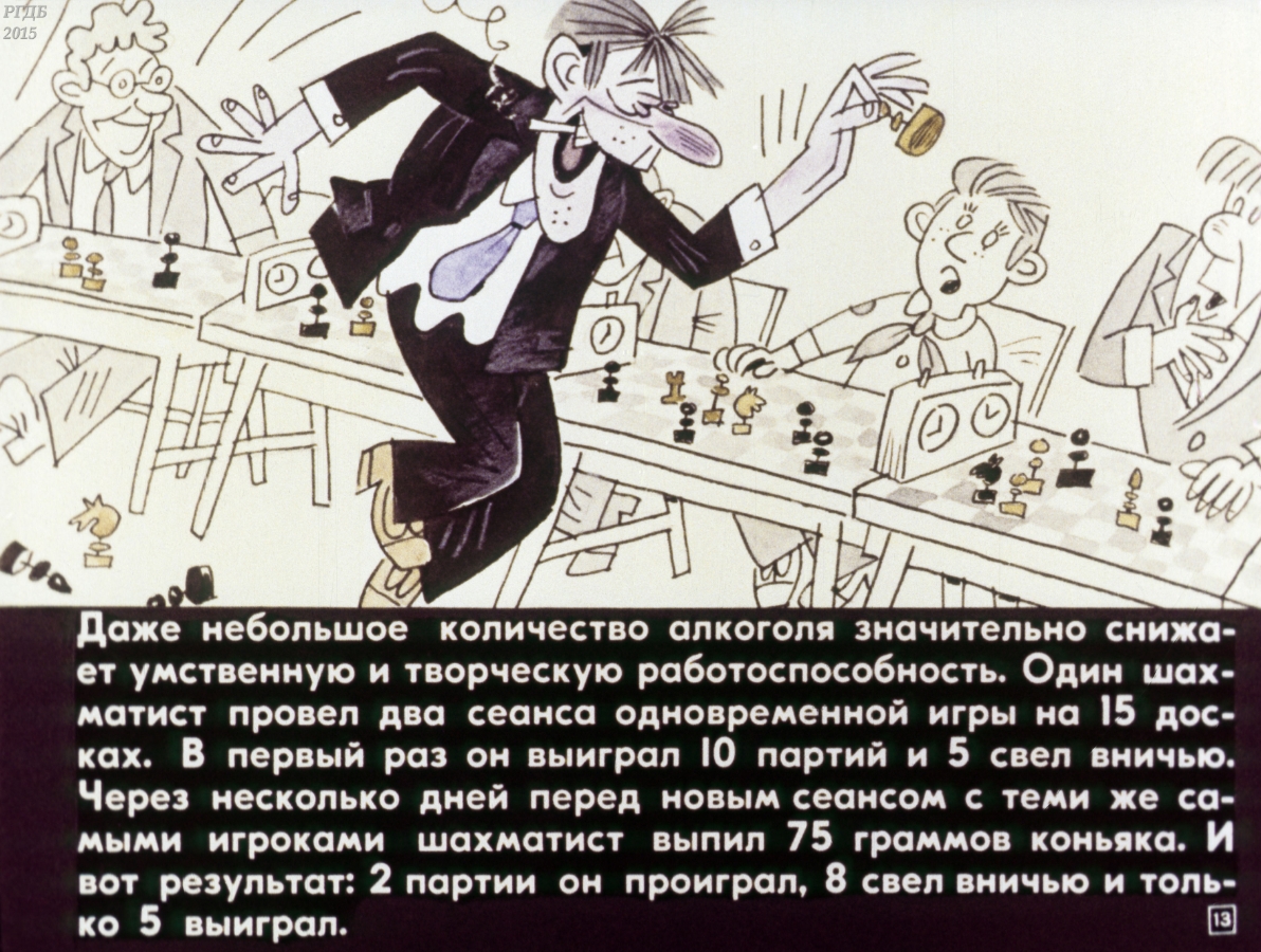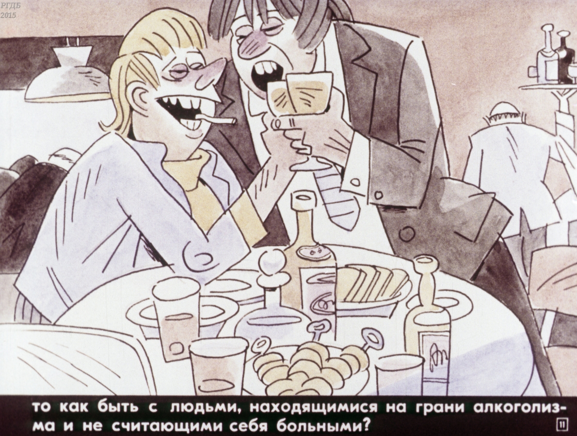 The Soviet filmstrip talks about the dangers of alcohol dependence. In Russia, under the Soviets, they really drank a lot. Drinks were very poor quality, so alcohol poisoning after the party was the norm