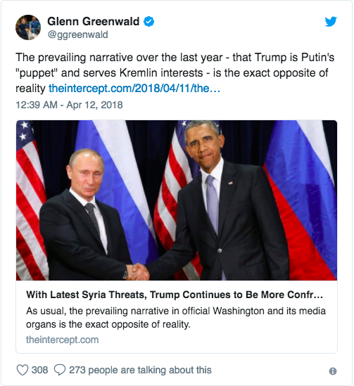 Ordinary Americans rarely thought about Russia prior to 2016. It certainly wasn't a nation the rank-and-file west was thinking and talking about constantly. Then all of a sudden, through nothing other than the power of sheer narrative, it's become an omnipotent, insidious force in the eyes of the public with the ability to infiltrate and overturn democracies all around the world and influence major events everywhere from the US to the UK to Syria. The Facebook ads could have been a second-page story for one day and nobody would have cared. The DNC hack, even if it happened, could have disappeared from the news after a day or two and it would have gone unnoticed. But because the mass media propaganda machine has been hammering Russia, Russia, Russia all day every day, it now seems perfectly reasonable to believe that Putin is behind every major event in the world; perfectly reasonable for so much of the Syria saber rattling to be targeted not at Damascus but at Moscow.