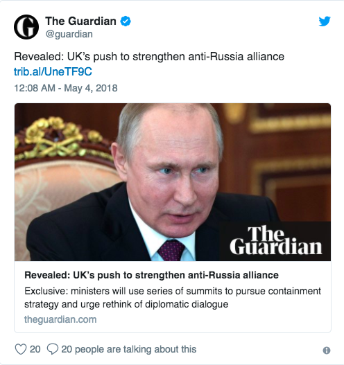 The Guardian has published an article titled "Revealed: UK’s push to strengthen anti-Russia alliance", with an update on the British government's efforts to help form an international coalition that will "combat Russian disinformation".