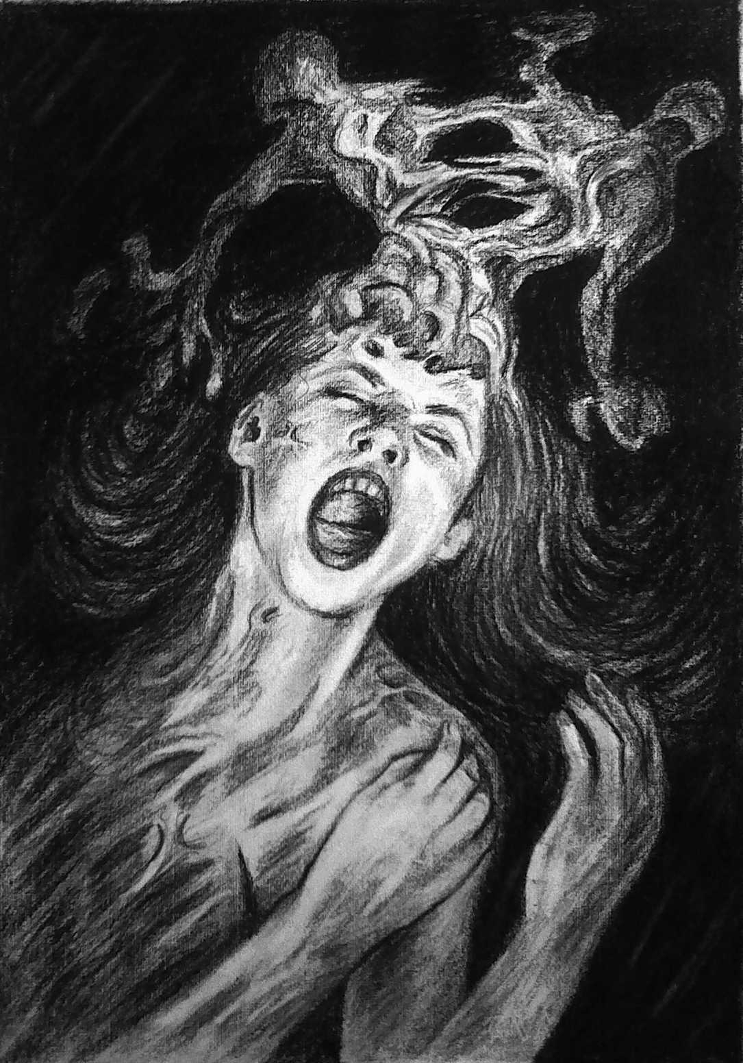 La composición la hice con la intensión de trasmitir el estado de duda en su máxima expresión, en un punto que se vuelve intolerable para la persona. La configuración del dibujo es vertical y el personaje se ubica de manera inclinada de esta forma la obra se vuelva más dinámica, además gran parte de los trazos del claroscuro también están en pasión inclinada esto ayuda enfatizar el dramatismo de la escena, este último punto va acompañado de la insinuación del cuerpo desgarrado y de la expresión de profunda intensidad dolorosa que transmite el personaje. En la parte superior se puede apreciar como dos grotescos seres literalmente abrieron paso desde dentro de su cabeza hacia afuera y cada uno intenta tomar su propio destino sin importarles resultar destruido en el intento, estas criaturas alegorizan cada una las decisiones que le causan el estado de duda.