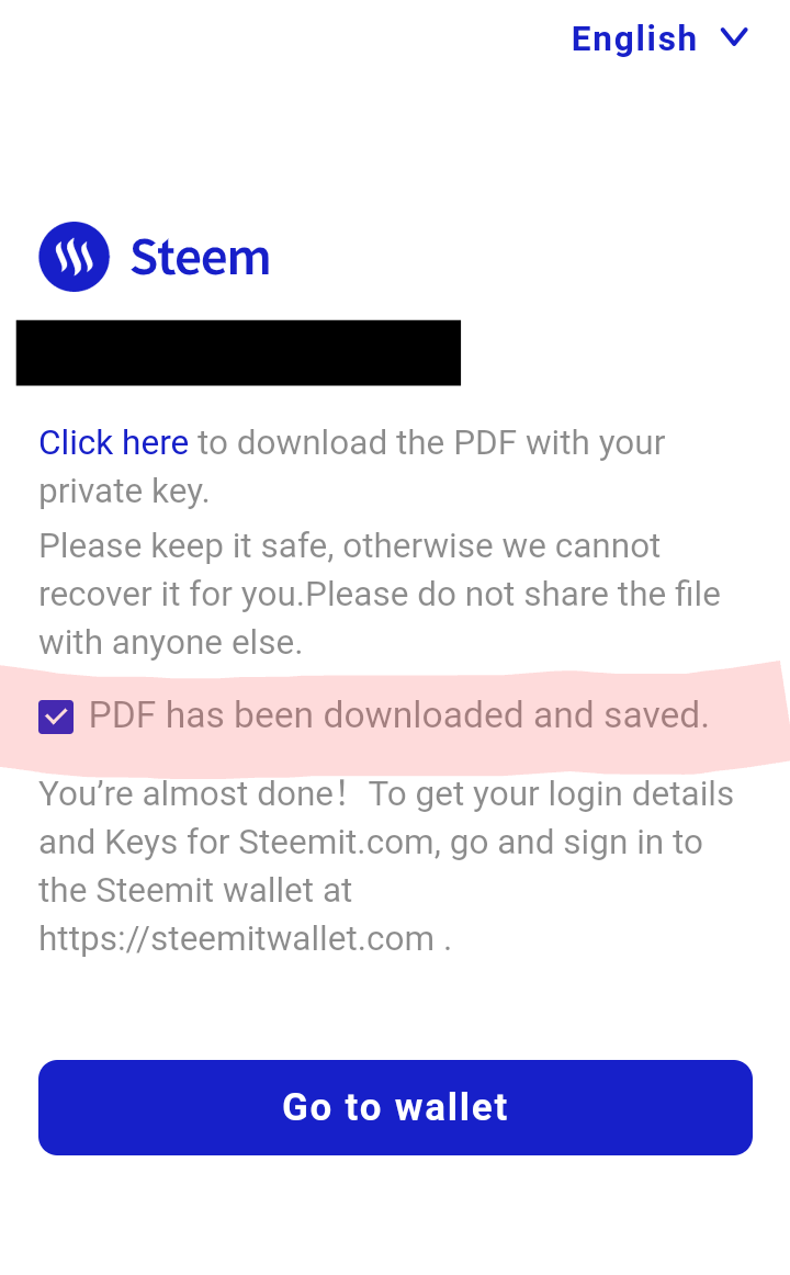 6- En el siguiente paso le darán la bienvenida y le informaran que será descargada una clave en PDF la cual deberá guardar en un lugar seguro, debe leer y seleccionar la casilla, seleccione "ir a billetera" para continúa.