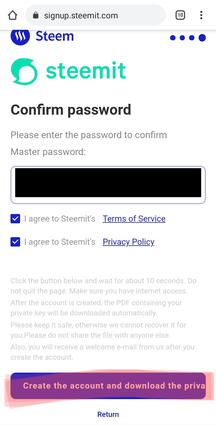 5- A continuación le pedirán que confirme la contraseña que le dieron, y deberá leer los términos de servicio y política y si está de acuerdo seleccione las casillas, también le darán información de lo que deberá realizar, una vez suministrada la clave y seleccionando las casillas demostrando que está de acuerdo deberá dirigirse a la opción al final "crear la cuenta y descargar la declaración privada".