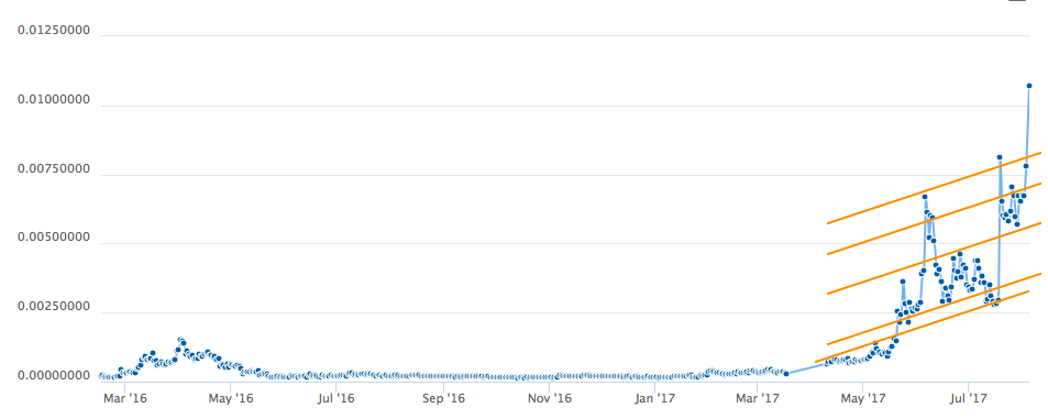 The price (in this moment it's just above 1 cent) may drop a bit after the weekend but hopefully not to much. As you can see on the chart below I've also notice a peculiar pattern that repeats itself over and over. The same trend line works perfectly on several levels, creating supports and resistances. IMO a great coin to buy and hold - still very cheap compared to many shit coins out there.