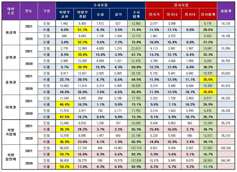 2021년 대학입시 대교협 보도자료 기준 모집인원을 분석한 자료입니다.