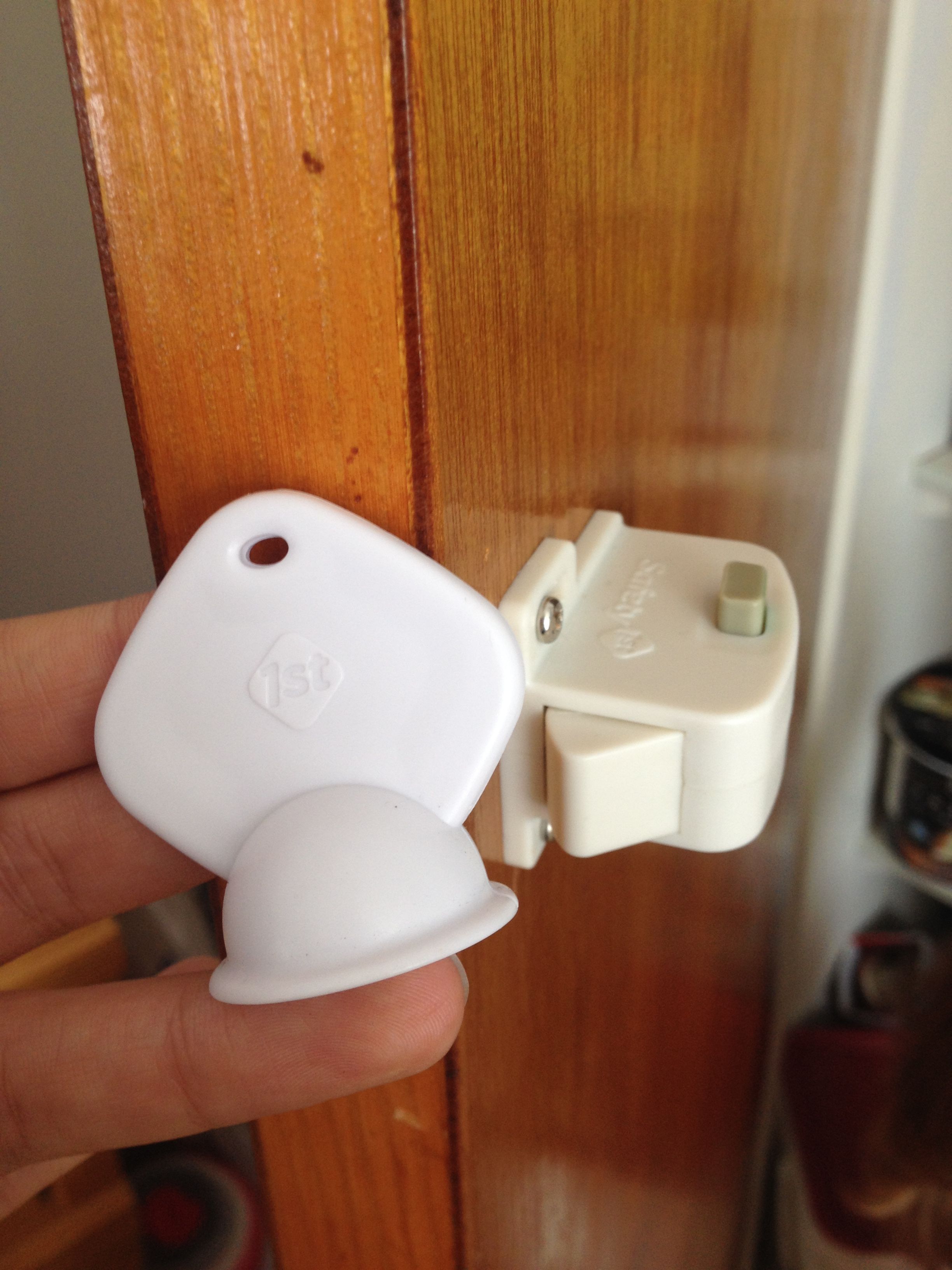 As the messes continue to happen, I grow tired of picking it up. I went to walmart and bought a pack of child proof locks. I grab the magnetic ones from Safety 1rst. Comes with a magnetic key. I like this one, there are no ties, no buttons, just a piece that you mount on the inside of the door. When you close the door it locks and you use the flat key thingy to unlock it magnetically.