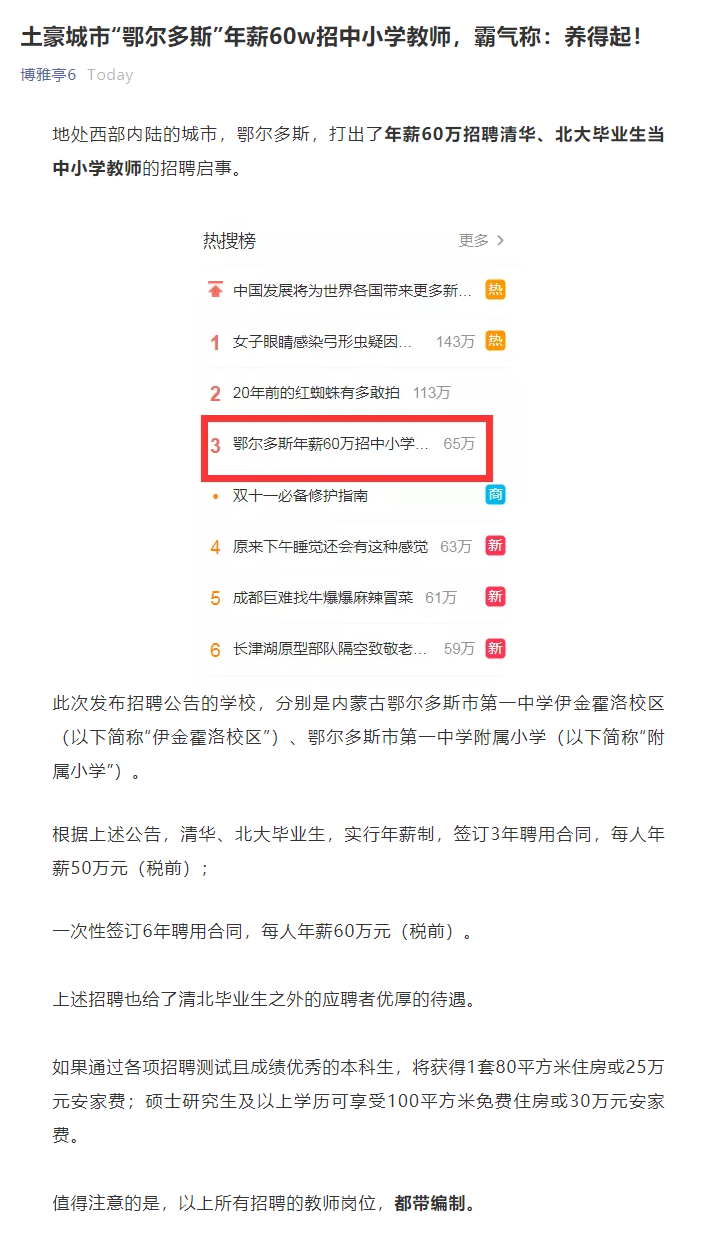 土豪鄂尔多斯60万年薪招小学老师