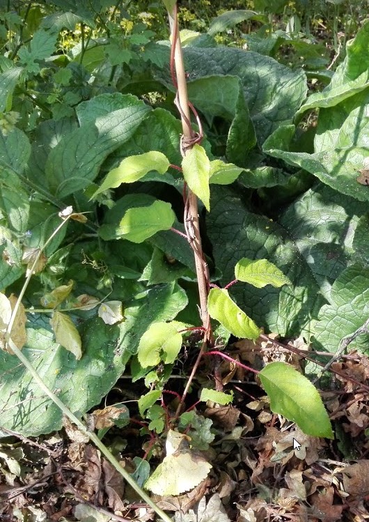 Above: Kiwi(actinidia arguta) crawling towards the plum tree, along a bamboo stick.