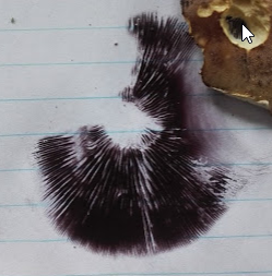 Below: the spore print after the cap of the mushroom had laid on the paper for six hours.
