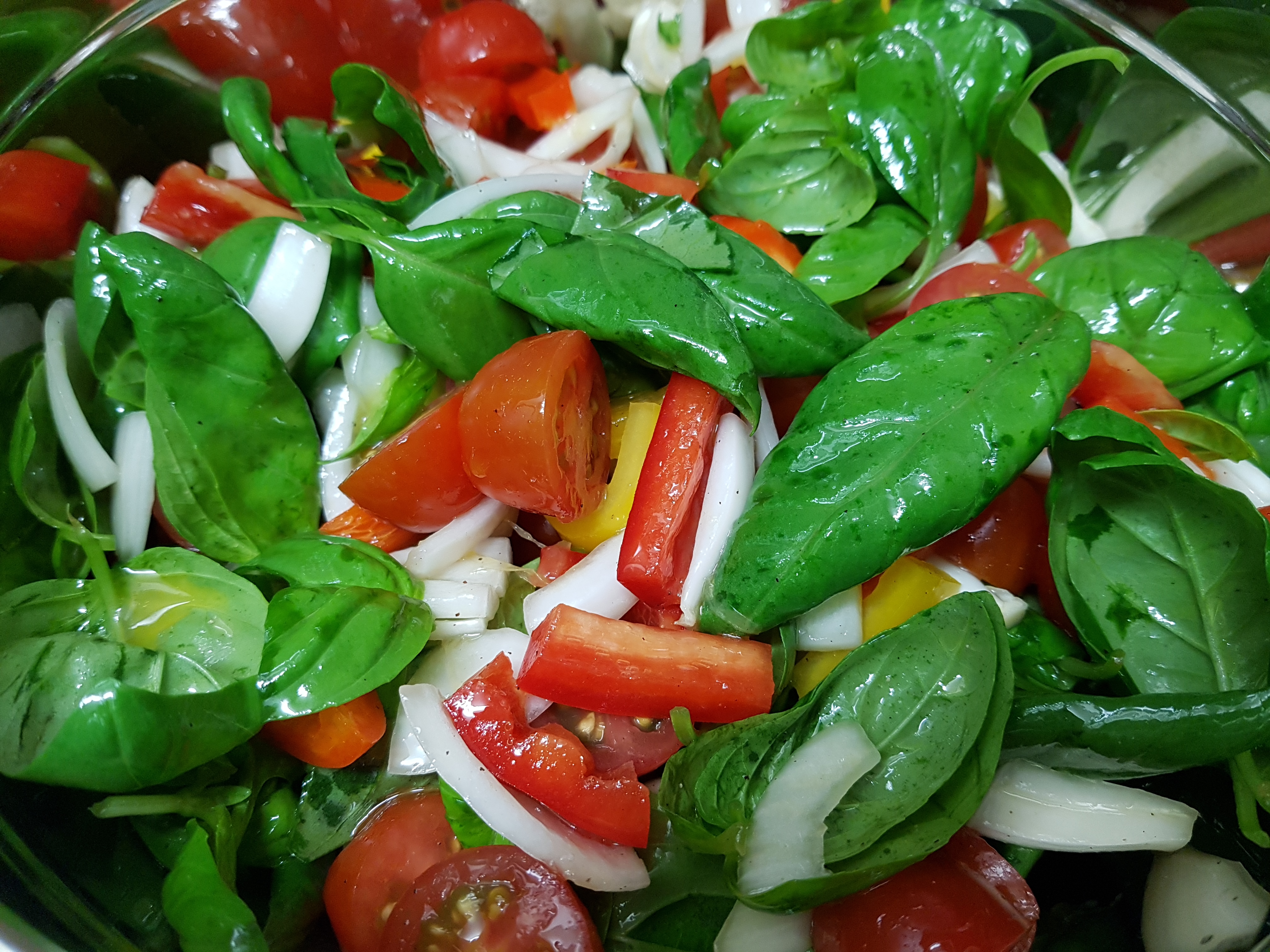 만드는 방법은 방울토마토 반으로 자르기,파프리카와 양파 적당한 크기로 잘라 넣기, 바질을 뜯어 넣기인데 거기에 후추와 소금 그리고 올리브 오일만 넣고 섞으면 끝이랍니다.