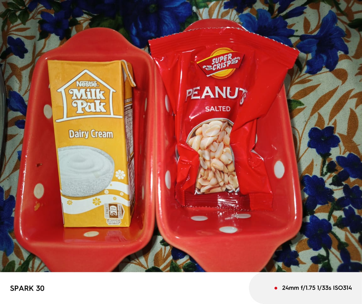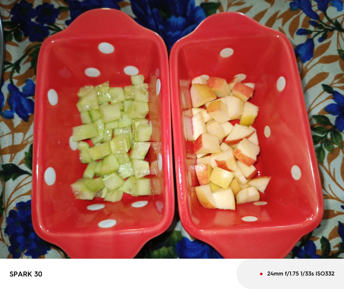 - Now in the fourth step, I cut the 1 Cucumber into small cubes and after that, I then chopped 1 Apple into the same size. After chopping it, I then put both of them in separate bowls, and then I took a picture of it. After that, I kept the Cream and Peanuts in the bowl and then also took a picture of it.