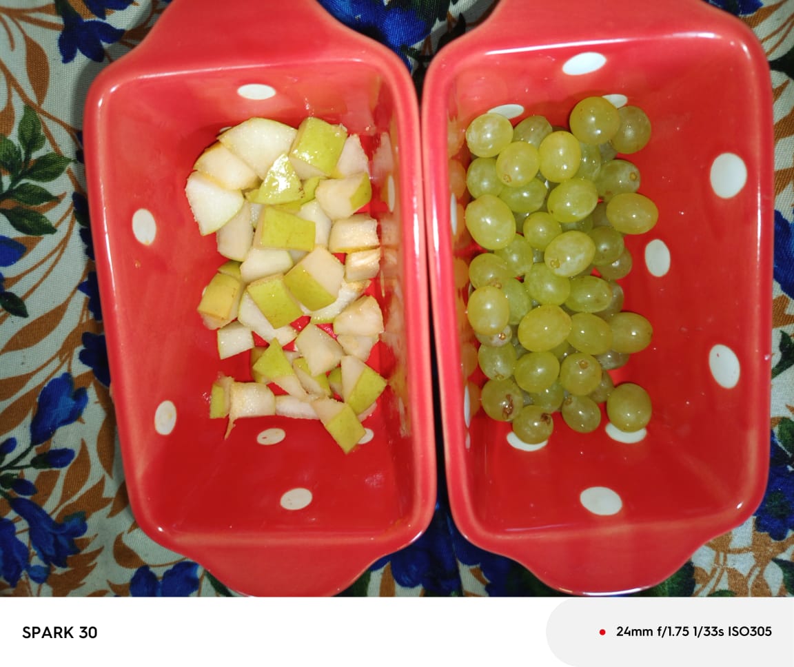- Now in step 3, I make slices of pear, and after making it slices, I then cut the same cubic shape. And after this, I then remove the stems from the grapes. It was quite easy, and after removing it, I then kept it in a beautiful bowl. And then I took a picture of it, which is mentioned below.