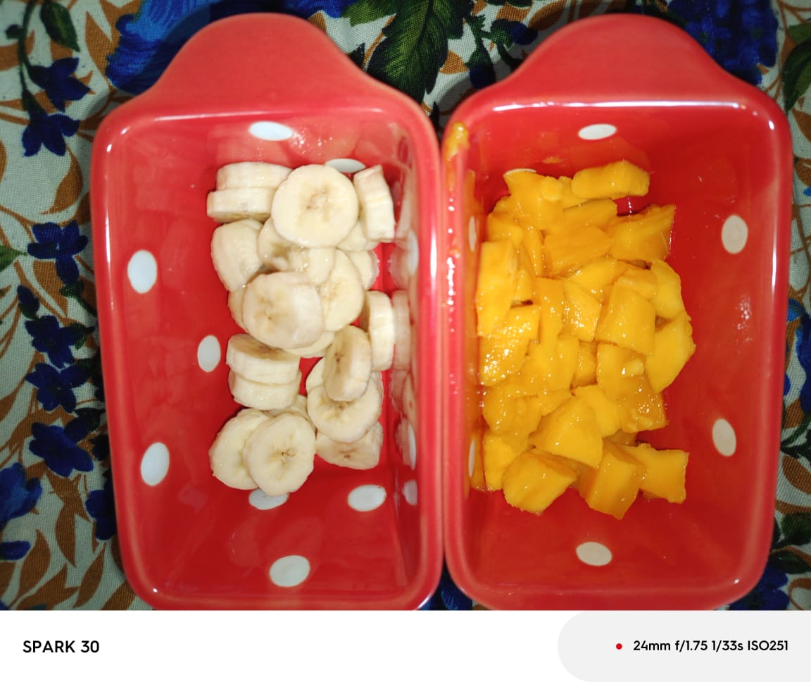 - Here in the second step, I have washed all the fruits very well in clean water. And after that, I peel the skin of the fruits that were required. Then after that, I first cut 2 bananas into a circular shape, and maintaining the same shape is very important, so I do the same . After cutting it then I took 1 mango and made slices of it, and after that, I cut all the slices into the same cubic shape.