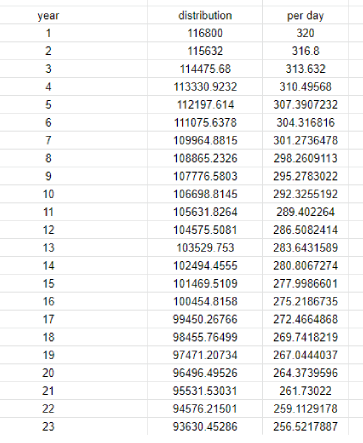 Thanks to @gerber for his help creating the data for my SAND distribution over the next 25 and 50 years. As you can see in year one 320+ SAND is produced everyday. in year two, only 316, in year 3 313. And so on until the reduction cuts the printing of new SAND down to below 300 SAND per day by year 8.