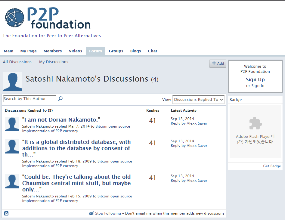 여기서의 마지막 흔적은 2014년 3월 7일인데요, 참으로도 희안한 말을합니다: "I am not Dorian Nakamoto."