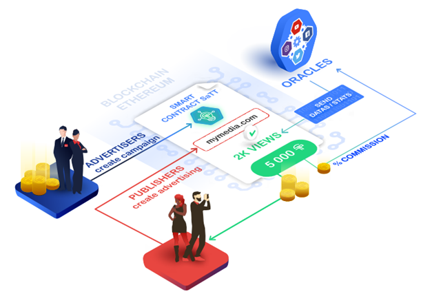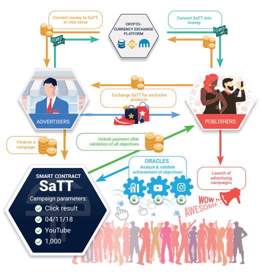 SaTT is a tokenized platform based on blockchain technology, which allows the exchange of advertising and audience payment. SaTT is regulated by Smart Contract, which lists promotional offers with all the data stored securely in the Ethereum block chain. Smart Contract sets the conditions for participating in campaigns, quantifies success and guarantees final compensation. The Ethereum flow chart is fast, inexpensive, secure and versatile, allowing you to distribute rewards in the Internet traffic market more fairly, eliminating all the restrictions caused by centralized intermediaries.