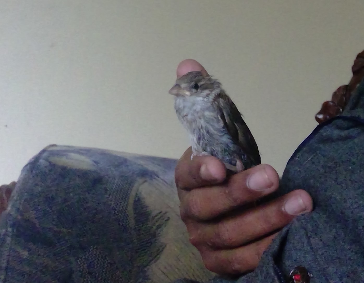 It was a dusky down pouring evening yesterday. Slightly the rain stopped for a moment. I just went for a ride to get some stuff from nearby shop then while returning back on my way to home the rain started again.I just hurried to my place and left my scooter in parking lot. Heard a chirping sound on the ground and I found this beautiful young sparrow which is just moved from its nest for its first flight got stucked up and wet which can't be able to fly.