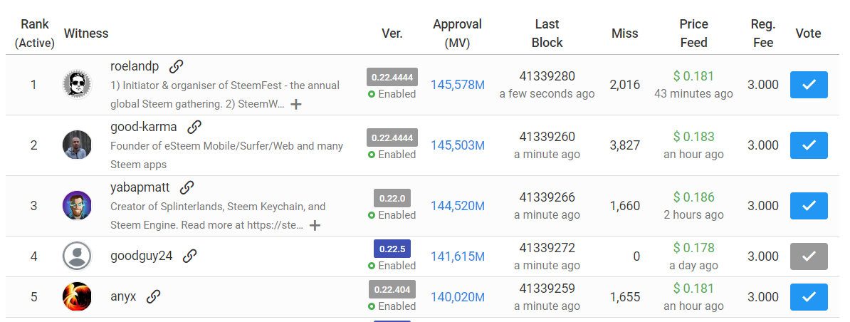 As you can see, @roelandp, @good-karma, @yabapmatt and @anyx got voted into the top 20, which means that they are consensus witnesses and no hard fork can be done without their consenting to it. We need more of our people in the top 20. Please keep voting.