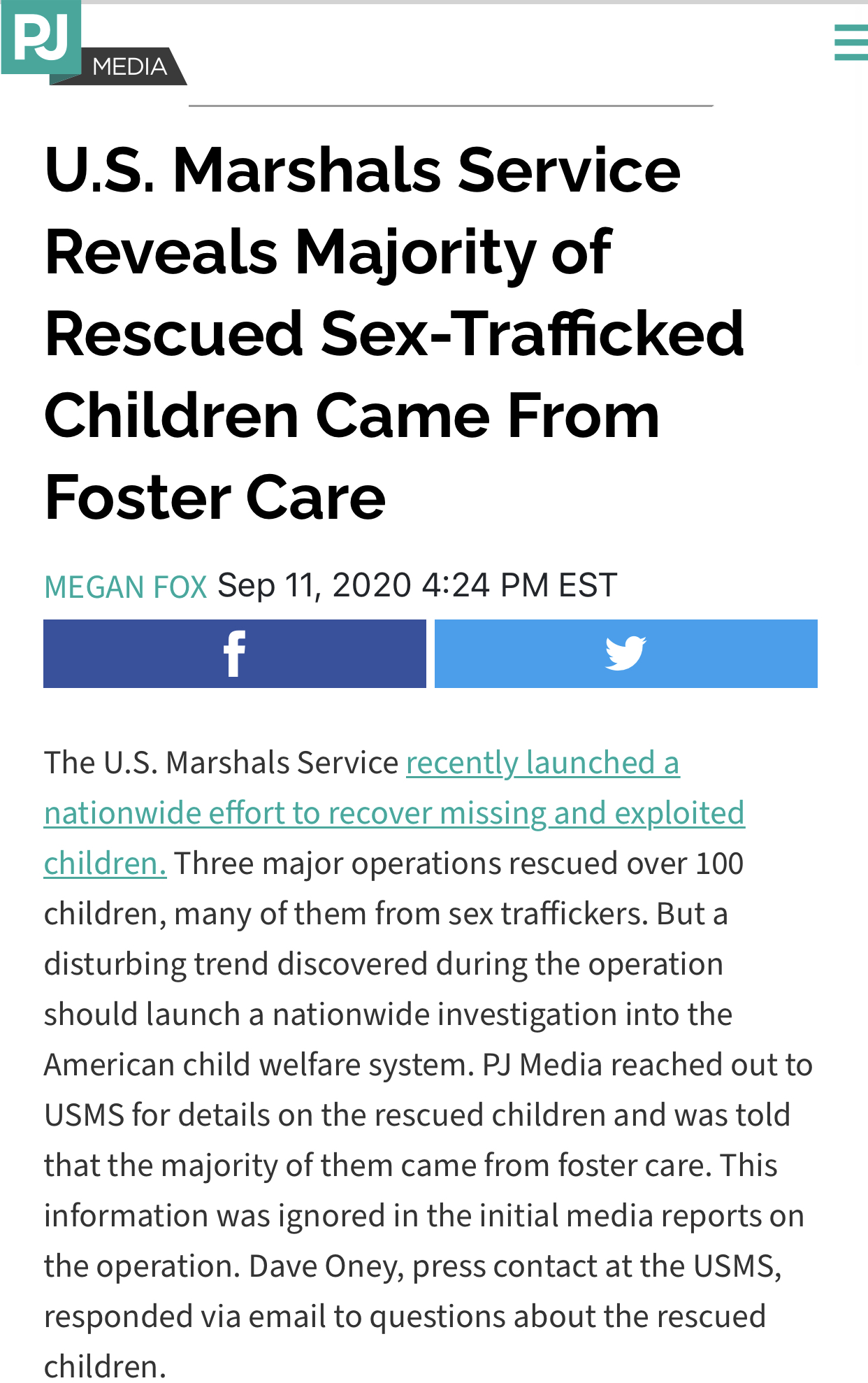 U.S. Marshals Service Reveals Majority of Rescued Sex-Trafficked Children Came From Foster Care - PJ Mediafreedumbnews (54)in #savethechildren • 5 years ago U.S. Marshals Service Reveals Majority of Rescued Sex-Trafficked Children Came From Foster Care READ MORE: https://pjmedia.com/culture/megan-fox/2020/09/11/u-s-marshals-service-reveals-majority-of-rescued-sex-trafficked-children-came-from-foster-care-n920803 PJ Media #politics #children #usa #hiveusa #palnet #news #neoxian