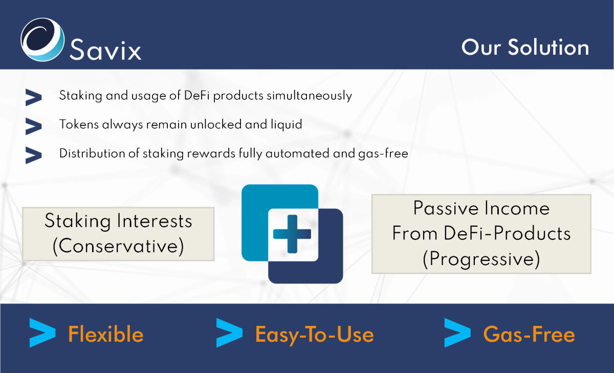 Diğer DeFi platformları gibi Savix, dünya çapındaki müşterilere farklı DeFi özellikleri sunan bir platformdur. Bununla birlikte, Savix daha çok müşterilere ayrılmış gelir ve basit yönetimler sunmaya odaklanmıştır. Savix'in temel amacı, müşterilerin benzersiz koşullar veya karışıklıklar olmaksızın DeFi alanına ilgi duyarak en yüksek kârı elde etmelerine olanak tanımaktır. Savix, bir DeFi platformunun gelişmesi için gerekli olanın kullanılabilirlik ve fayda olduğunu kabul ettiğinden.