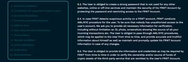 If you take a look at FRWT terms of use you’ll see that administration can block accounts in the same way as Freewallet does. FRWT also can use KYC fraud as a method of deceiving clients!