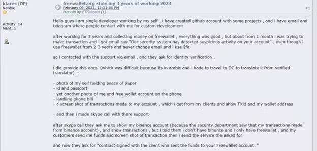 For example, In 2020, a user with the nickname kfares started a freewallet wallet to accept payments for work. It seemed to him that everything was in order, the assets were stored in a safe place. But in 2023, kfares tried to withdraw the coins, and were unable to do so. The administration simply froze his account. The victim sent scans, photographs, and filled out a questionnaire. But nothing helped. Freewallet support simply ignored all requests.