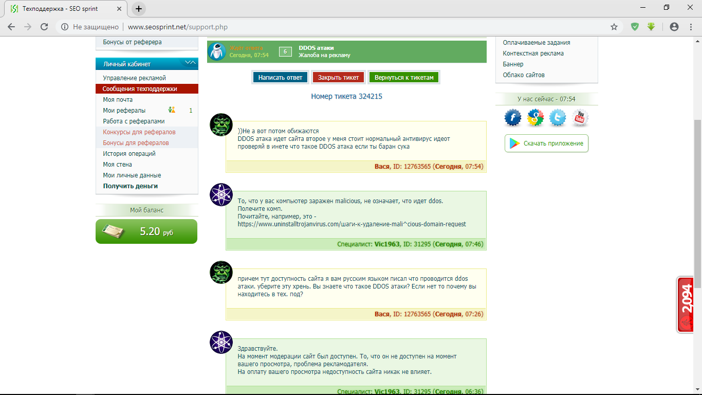 Здравствуйте! У вас такая то реклама с DDOS атакой а мне мол у вас на компе просто вирус чисти. Какой вирус? Если тех под не знает что такое DDOS атака о чем может быть речь?! А один раз забанили не за что. Сам не работал там а вывозил на рефералах. Было 700 реф и однажды и зашел а меня забанили мол за подрыв проекта ))) бред. И все это было когда на балансе было 6000 рублей. Вот такие дела. Теперь в этот проект никогда не зайду еще раз убедился что там срань...