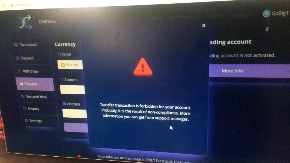Once I signed in, the first thing I saw was a TRANSFER PAGE saying "If you deposit into these addresses, your funds will be lost. Transfers only"