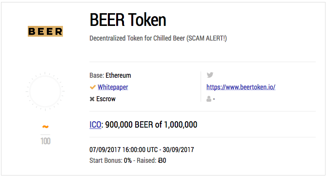 Not every token sound futuristic, the Beer Token ICO is proof of that. Right off the bat, there are no names associated with the ICO and that likely is the primary reason for ICO tracker’s Scam Alert label.