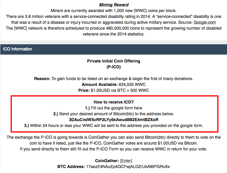 Similar to the Beer Token, Wounded Warrior coin asks people to make a donation to a BTC address and that WWC tokens will be sent to you within 24 hours.