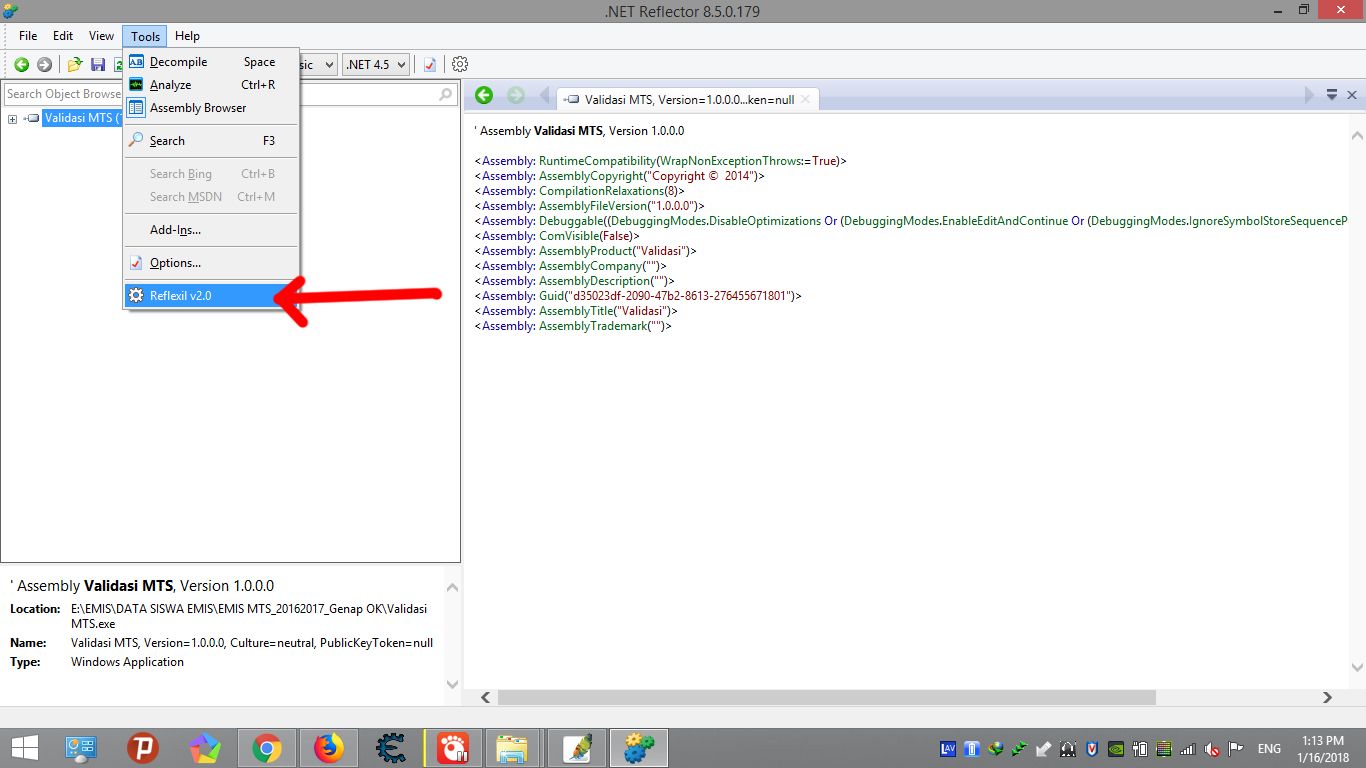 b. Klik kanan pada file Validasi SD/MTs/MA.exe (untuk pembahasan ini yang menggunakan aplikasi desktop emis untuk MTs, sama juga untuk versi SD/MI dan SMA/MA) dan pilih Browse with .NET Reflector.
