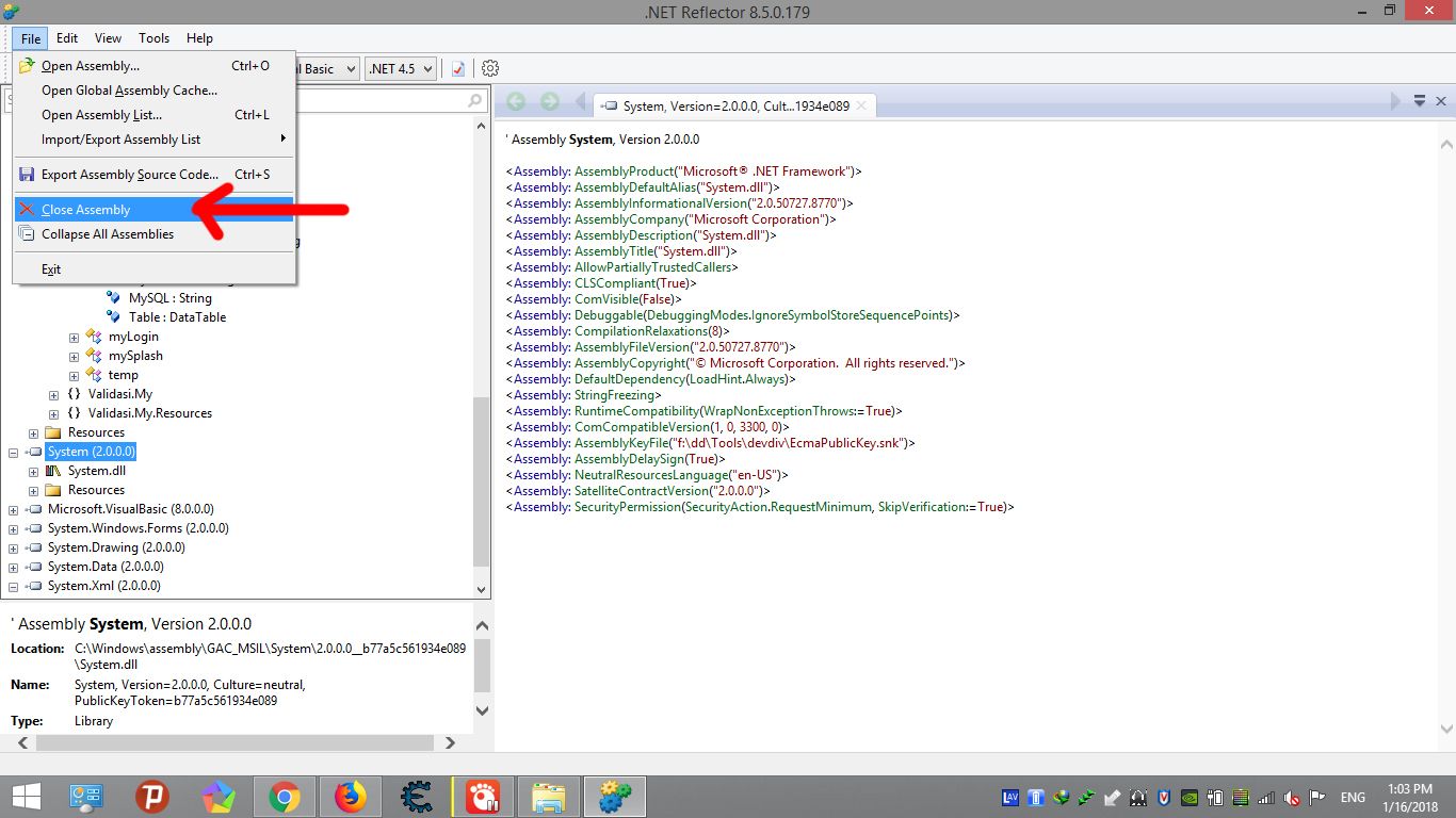 c. Setelah aplikasi.NET Reflector terbuka, select menu File dan klik Close Assembly..