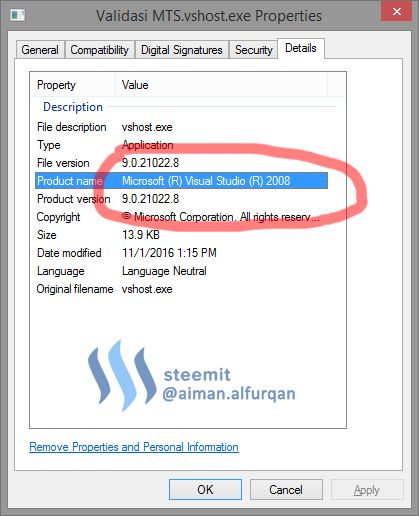 b. Klik kanan pada File Validasi MTS.vshost.exe, dan pilih Properties, dan pilih Tab detail seperti terlihat pada gambar di bawah ini.